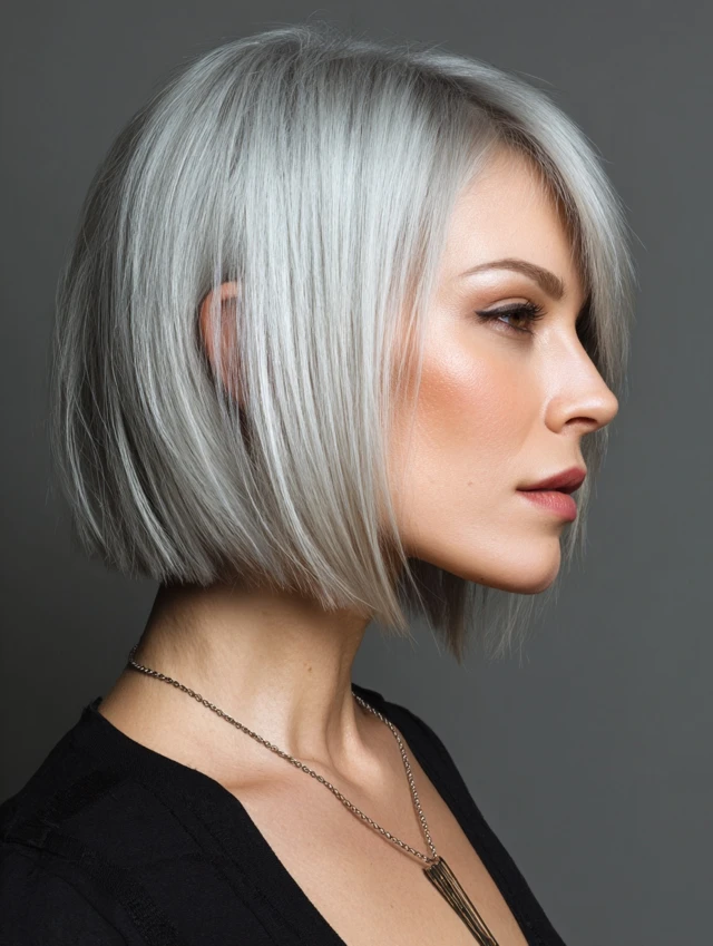Clean, straight lines give a polished, refined look. This simple yet sophisticated cut highlights the sleek sheen of gray hair, especially when styled smooth.