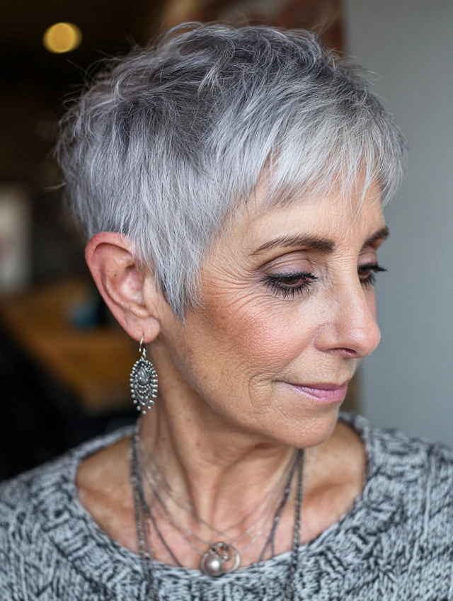 A pixie cut with feathered layers is timeless and elegant, especially in gray or silver tones. It’s easy to style and keeps hair light and lively.