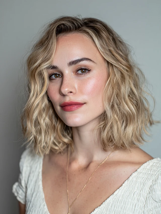 Slight lift at the roots and textured waves give your hair structure without emphasizing cheek width.