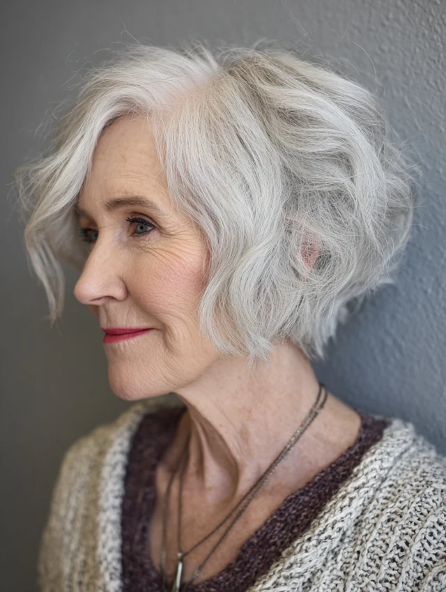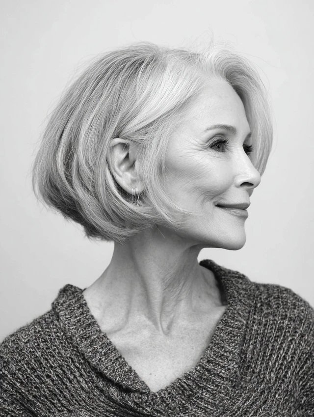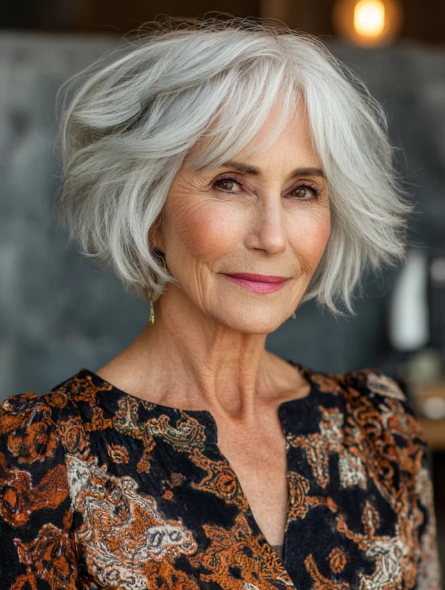 A classic yet chic choice, the chin‑length bob softly frames the face and looks elegant with natural gray hair. It’s versatile enough to wear sleek or with gentle waves.