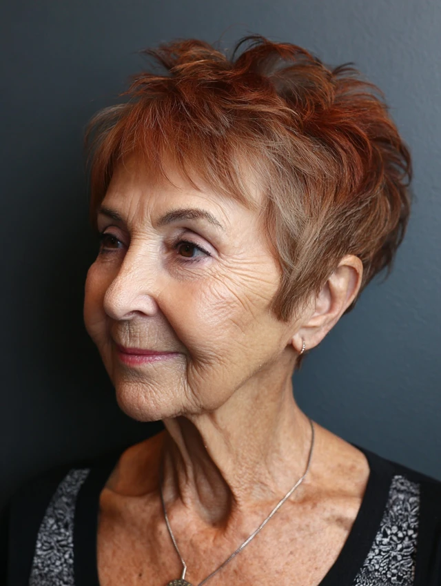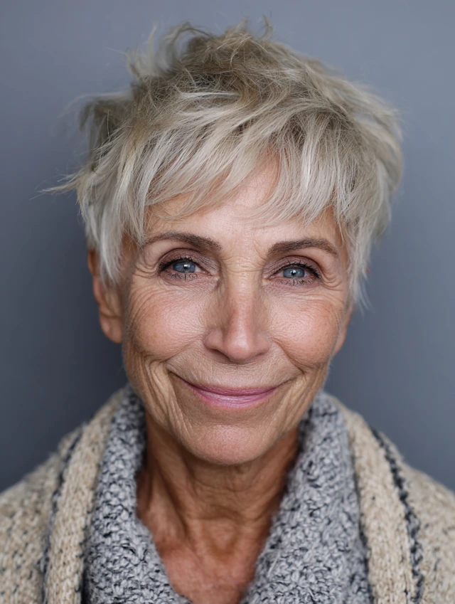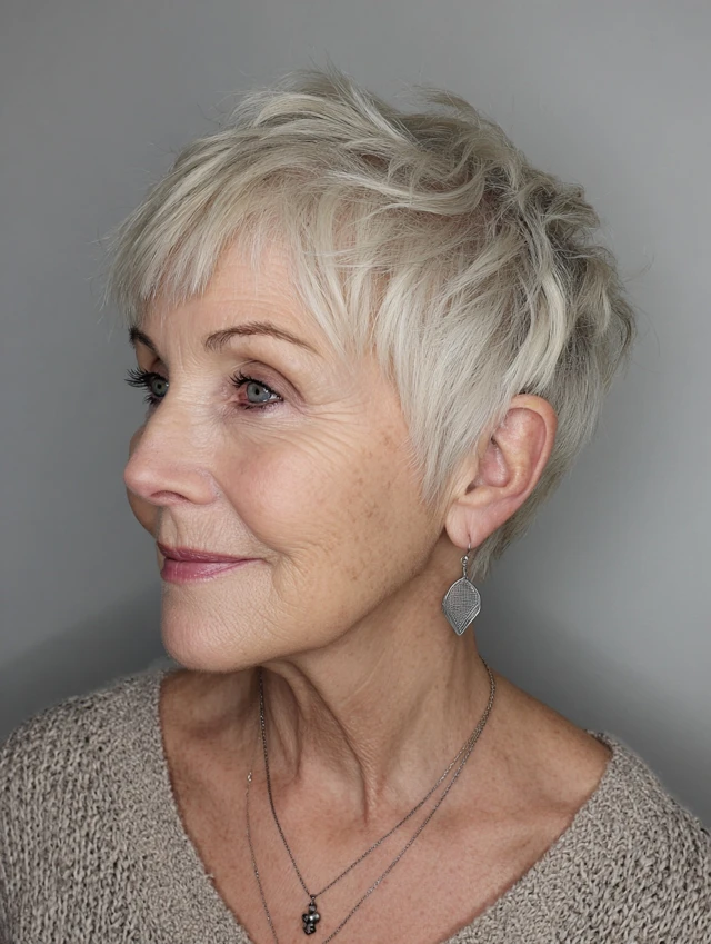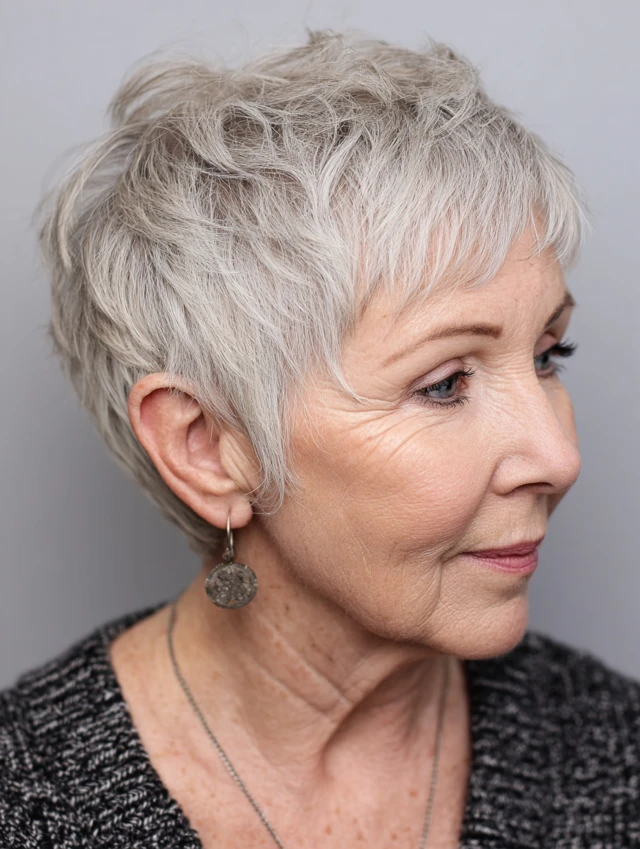 A light, layered pixie adds movement and volume without fuss — just a bit of styling cream or mousse and you’re ready. This is one of the most low‑maintenance short cuts for mature women.